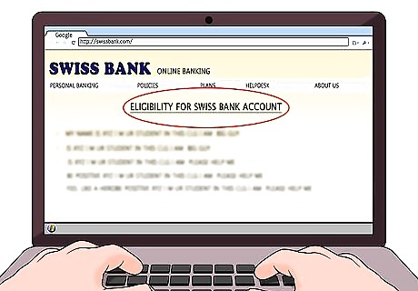 Find a bank that meets your needs. There are approximately 400 banks in Switzerland, though two banks in particular - UBS (Union Bank of Switzerland) and Credit Suisse Group - account for almost half of all investments in Swiss banks. One of the biggest factors in determining which bank to choose is what you're looking for in a bank. Comparing policies and investment opportunities at a variety of top-rated banks can help you examine the pros and cons of each bank and find one that's right for you. If privacy is a factor, consider going with a bank that does not have branches in your home country. Most banks are governed by the laws of the nation in which a given branch is located, not by the laws of the head office's nation. Be aware that unless a bank has earned a status of qualified intermediary (QI), that bank may have to report the owner of an account and all money received from the United States to the IRS, if the account holder is a US citizen.