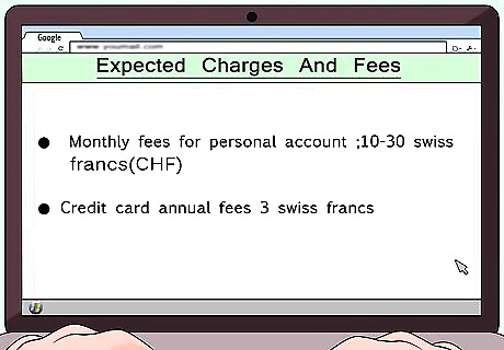Expect to pay charges and fees. Most Swiss banks charge a monthly maintenance fee for personal accounts, and may charge additional fees for a credit card or Carte Maestro (debit card). Monthly fees for personal accounts tend to range anywhere from 10 to 30 Swiss Francs (CHF), though customers can usually have these fees reduced or waived by switching to electronic banking statements, taking out a mortgage with the bank, or depositing a sizable amount of money into that account. Credit cards and Carte Maestros tend to have annual fees that range up to 3 Swiss Francs.