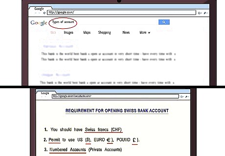 Choose an account type. There are many different types of bank accounts available through Swiss banks. Certain bank accounts require a minimum amount for the initial deposit, a minimum account balance, and other qualifying factors. Compare the requirements for each type of account you're interested in opening to find one that will work best for your financial needs. Some banks require customers to use Swiss francs (CHF). Others permit the use of US dollars, euros, and other forms of currency from around the world. Check with the bank you wish to do business with to see what form(s) of currency they accept if exchanging into other currencies is a concern for you. One of the most secretive accounts is what is known as a numbered account. These accounts are not, strictly speaking, "secret" or "anonymous" accounts. Certain high-level bank employees will know the identity of the account holder(s), but these accounts still offer some degree of privacy, as numbered accounts require the bank to use only the account number in any and all correspondence regarding the account. However, these accounts tend to have a number of restrictions, and maintaining a numbered account may come with annual fees of up to 2,000 Swiss Francs. It is worth noting that some Swiss banks are reluctant to offer general savings accounts for foreign citizens. Instead, Swiss banks focus on providing foreign citizens with investment opportunities and wealth management specialties.
