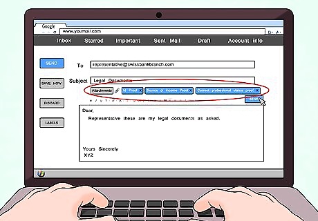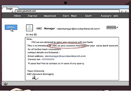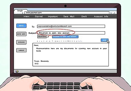 Provide the necessary documentation. Like most banks around the world, Swiss banks are required to verify the identity and source of income of customers who wish to open a new account. For this reason, most banks require potential clients to meet in person with a bank representative to complete the verification process. Customers may be required to provide a valid passport as a means of identification. Bank representatives may ask for documentation to verify the origin of income. For example, bank representatives may request a copy of a contract proving that a house was sold to acquire the money in question, or receipts from securities sales, or a verifying statement from a bank you've done business with in the past. Banks may verify the listed address of a potential customer by sending some type of correspondence through the mail.