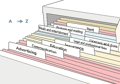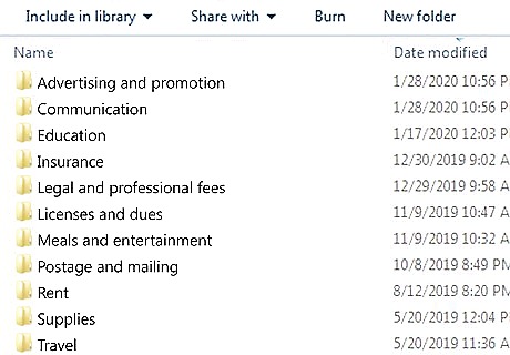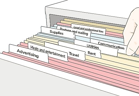 Organize your receipts by category. When you do your taxes, you'll have to total your deductions under specific categories. If you file your receipts in these categories, you'll have already done this work. At tax time, all you'll have to do is add them up. Categories you'll need include: Advertising and promotion (business cards, mailing lists, website development, social media ads) Meals and entertainment (lunch meetings, dinners with clients) Travel (airfare, auto expenses, tolls, mileage, lodging, meals while away on business) Rent (payments for leased office space or rented equipment) Utilities (electricity, water, heat/air-conditioning, trash pickup for the workplace) Communication (phone expenses, internet access) Supplies (office materials, cleaning supplies, coffee or bottled water in the office) Postage and mailing (PO Boxes, shipping fees) Legal and professional fees (accountant/bookkeeper fees, attorney's fees) Insurance (business liability insurance premiums, worker's compensation premiums for employees) Licenses and dues (business licenses, professional licenses, trade association dues, franchise fees) Education (professional development, continuing education for professional licenses, job training for you or employees)Tip: If a receipt includes expenses in multiple categories, make a copy of the receipt for each of the categories. On each copy, note the total deduction from that receipt in that category.