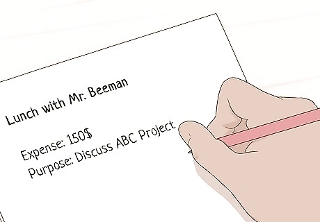 Note the business purpose of each expense on the receipt. Keeping in mind that you're going to be keeping receipts for 6 years, something that seems obvious a week after you incur the expense might not be something you remember several years later. While this may not apply to office supplies, meals and travel can be more difficult. For example, if you went out to lunch with a client, you might note the client's name and the general subject of the lunch meeting. With travel expenses, note the reason for the travel. You might also include a brochure or other information. For example, if you traveled for a trade convention, you might attach a brochure for the convention to the receipts connected to that convention.