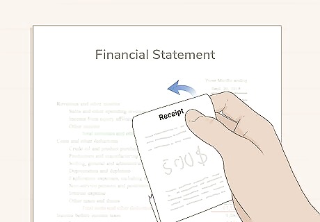 Match receipt transactions with financial statement entries. When you get your business banking and credit card statements each month, print them out and compare them to your receipts. Mark or highlight every transaction on each statement that you have a receipt for. If there's a transaction on one of your statements that you believe is deductible, but you don't have a receipt for, you might be able to get a receipt reprinted for your records. Contact the vendor to find out if this is possible.Warning: Avoid using cash to pay for business expenses. It's difficult to track and doesn't leave a paper trail like credit or debit cards do.