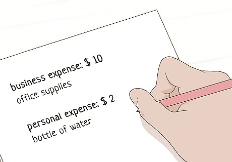 Separate business and personal expenses on the same receipt. Ideally, you're keeping business and personal expenses as separate transactions. However, it's not always convenient to do so. If you have personal expenses on the same receipt as business expenses, underline or highlight the business expenses and calculate a new total for tax purposes. For example, if you bought office supplies and picked up a bottle of water for yourself while you were checking out, the bottle of water would be considered a personal expense, not a business expense. You'd deduct the cost of that water (don't forget sales tax, if applicable) from the total to get the new total of your deductible expenses.