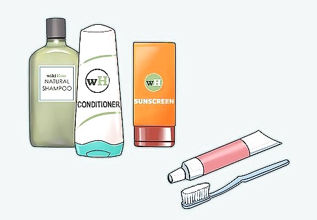 Pack toiletries and bathroom items. No matter what season you’re traveling to Florida, the toiletries you need are likely to be pretty similar. Put liquids in 3.4 oz (100 ml) containers and put the containers in a 1 quart bag. If you’re flying and not planning to check your baggage, you will have to put all of your liquids in small containers in order to get them through security. You can usually pick up travel-sized bottles of toiletries in the drug store. Depending on your personal needs, don’t forget shampoo conditioner razor shaving cream aftershave toothbrush toothpaste lotion or moisturizer tampons and/or pads makeup sunscreen soap prescription medicines over-the-counter medicines you take often (such as pain relievers, vitamins, or antacids)