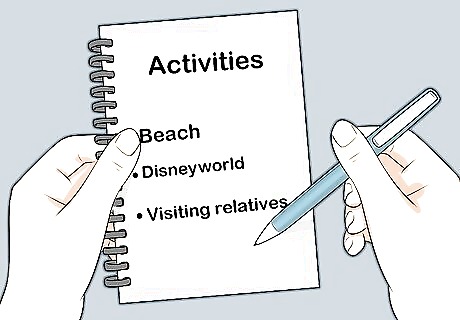 Figure out how much luggage you can bring. If you’re flying, decide whether you are checking bags or just bringing carry-ons. If you’re driving, you’ll likely have a bit more space to pack extra items, depending on how many people you’re sharing your car with. Check the regulations from the airline you’re flying with regarding size and weight requirements for both checked baggage and carry-ons. Most airlines will let you bring a small carry-on suitcase or overnight bag plus a personal item such as a purse, backpack, or laptop case. (A backpack is usually a good option if you’re going to be doing many touristy activities.)
