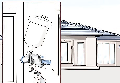 Paint the trim. Once the sidings are complete it's time to go back and paint the trim, whether it's the same color as the rest of the house or not. This is can be quite time-consuming, but will really give your paint job a professional-looking finish. A brush is normally recommended for painting the sidings, as it allows you to be precise however a small 6-inch roller can help to speed up the process, especially on fascia and window sills. As with painting the sidings, you should work on painting the trim from top to bottom - start with any gables and dormers, then do eaves and gutters, then do second-story windows, first-story windows, doors and finally the foundations. When painting the windows, you should protect the glass from paint splatters by covering with masking tape or using a paint shield. Pay special attention to window sills when painting, as these bear the brunt of bad weather and can look more worn than other areas. If necessary give them 2 or 3 coats of paint and don't forget to paint the undersides. It is easier to paint doors if you remove any knobs, knockers and numbers first. Ideally, you should also remove the door from its hinges and lay it flat on the ground before painting, working first on one side, then the other. This will also make it easier to paint the frame and door jambs.