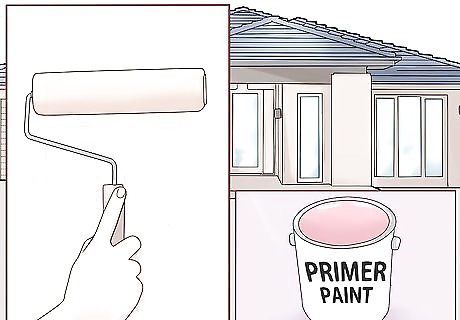 Prime the surface. In some circumstances, you will need to apply a coat of primer to the surface of your house before you can begin painting. Primer provides a good foundation for the paint and will help it to last longer, as it provides extra protection from the elements. You will need to apply primer to certain distressed areas of the house, especially if your prep work exposed any raw wood or bare metal, or if you scraped away a lot of loose paint. You will also need to apply primer if you are painting new wood for the first time, or if you are drastically changing the color of your home. The type of primer you use will depend on the type of paint. If you plan on using latex paint, you will need latex primer. If you plan on using solvent-thinned paint, you will need a solvent-base primer, and if you use metal paint, you will need a metal primer.