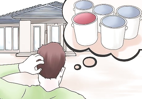 Choose your paint. Choose a high quality exterior paint, such as 100 percent acrylic latex. This will produce a better color, dry faster and be more durable in the long run. Look for paint with a higher percentage of volume solids, and opt for cans labelled "premium" or "super-premium" rather than choosing budget brands. Make sure you choose paint specifically meant for exteriors since it will hold up better than interior paint. Also put some thought into the color you choose for your house. Take the style of your home into account and make sure the paint color complements the roof material and any brick or stone accents. Consider getting samples of your top colors and painting swathes on an obscured portion of your home. Take a couple of days to see how each of the samples look in different lights and decide which ones you prefer.