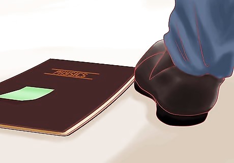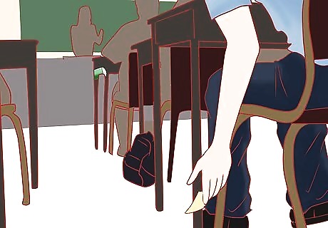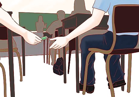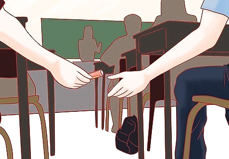Stretch your hand over the edge of the receiver's desk and let the note drift down. A simpler way to pass the note is to place your hand on the receiver's desk as if steadying yourself and letting the note slide out. Or if your neighbor has a purse or bag that is slightly open, you can drop the note in there.