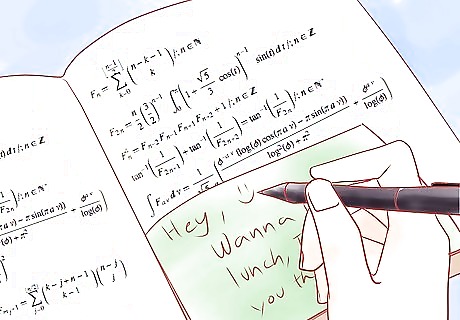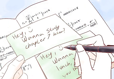 Get a friend to ask you to borrow a pen. Write the note on a piece of paper small enough to fit inside the cap of a pen. Roll the paper and place it inside of the pen. Pass it to the receiver. After that, just wait for them to pass the pen back! They can replace your note with another note and pass it back. Just remember to watch the teacher!