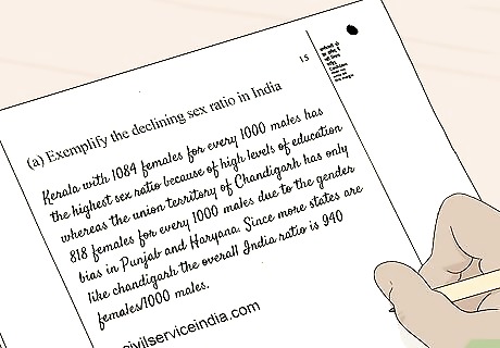 Read sample answers to previous exams on the UPSC website. You can access sample answers to previous years’ tests on the UPSC website. Find the sample answers for the subjects you will be tested on in your exam and read through them carefully. Take notes on the answers and highlight or underline important details to help you remember them.Tip: If there are study courses in your area, you might also consider enrolling in one to help guide your studies. If no courses are available where you live, look into an online study course.