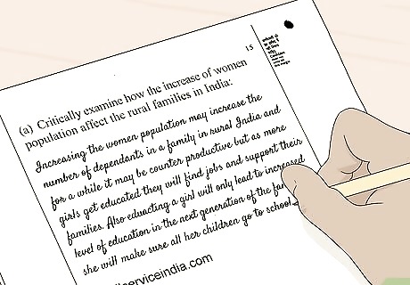 Compare the pros and cons if asked to “critically examine.” Whenever a question asks you to critically examine a topic, it is asking you to provide a thorough comparison of the positives and negatives. After you explain both sides of the issue, state a conclusion about the topic’s implications. Remember to stay within the word limit for the question. This can be more difficult for critically examine questions, so think through your answer and plan it out before you start writing.