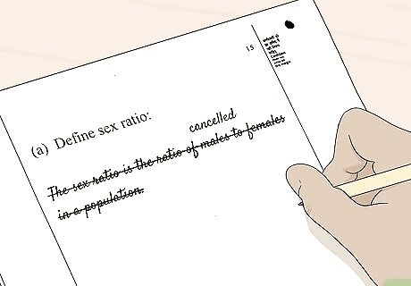 Strike through an answer and write “cancelled” if you make a mistake. If you write something that you decide is incorrect and you need to rewrite your response, draw a line through each word in your answer and write the word “cancelled” over the section that you do not want counted. Then, write the new answer below it. Only do this if you make a mistake. For example, if you misunderstand the question and start to answer it one way, then realize that it is incorrect, you could strike through what you have written and write “cancelled” before responding correctly. You can also cancel portions of the answer if some of it is correct. Think through your answers carefully before you begin writing to avoid using up the limited box space with a mistake.