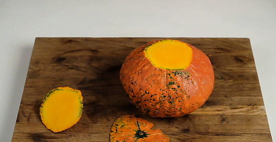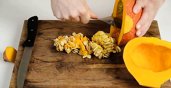 Prepare the pumpkin by washing and slicing it into smaller sections. Depending on how big your kitchen appliances are, cut the pumpkin into halves or into more sections. After doing so, use a large spoon to scoop out the seeds and other fibers from the pumpkin's inside and place them into a bowl. The inner seeds of the pumpkin are edible and make for a yummy snack! You can save them for later or choose to roast them when you cook the pumpkin.