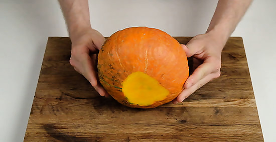 Set up the pumpkin and the peeler. Turn the pumpkin on its side on a cutting board so that one flat side faces towards you and the other flat side is away from you. Place the peeler in one hand and use the other hand to hold the pumpkin steady while you peel.