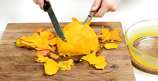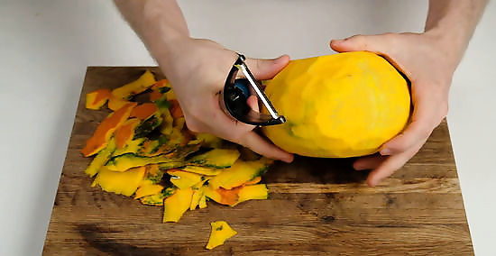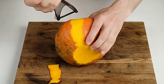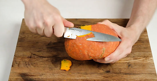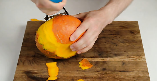Peel the pumpkin using the vegetable peeler method or the knife method. The skin should come off much more easily, but still be cautious when using sharp kitchen instruments. Look over the pumpkin and peel away any spots you may have missed.