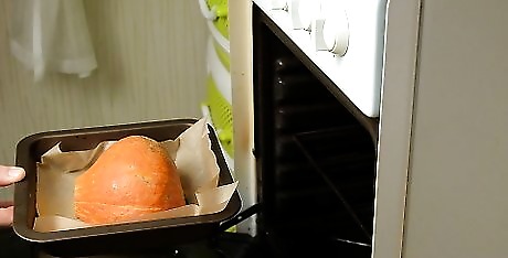 Bake the pumpkin in an oven. Pre-heat the oven to 375 °F (191 °C) degrees. Place the pumpkin halves or sections onto a baking sheet. Once the oven warms up, put the pumpkin into it and cook for 15 to 45 minutes, depending on the sizes of the sections.Check on the progress by sticking a fork into the flesh; when the fork easily punctures the flesh, take the pumpkin out and let it cool.