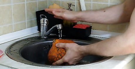 Wash the pumpkin to remove dirt and contaminants and soften the skin. Remove dirt and other contaminants from the skin by washing the pumpkin under warm water. Removing dirt keeps the pumpkin from beginning to rot, and warm water soften the skin, making it easier to peel off. Dry the pumpkin with a clean towel or let it air dry.
