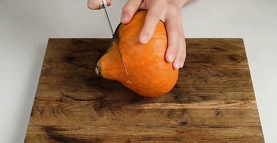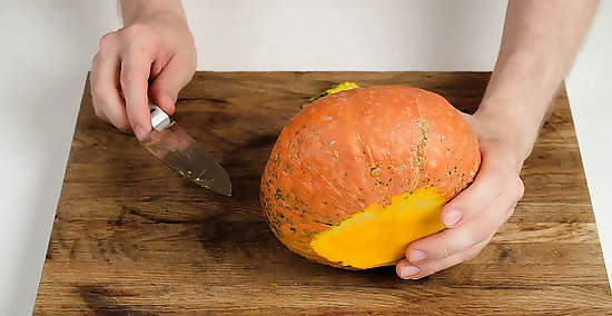 Place the pumpkin on its side and get your knife ready. Similar to using a vegetable peeler, you will want to place the pumpkin on a cutting board, with one of the flat surfaces facing towards your body. Hold the knife in your fist with the blade pointing outwards.
