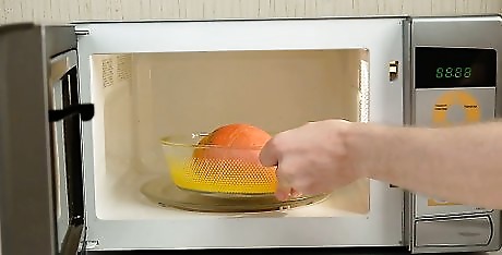 Cook the pumpkin using a microwave. Place the sections of the pumpkin into a microwave-safe dish with a small amount of water. Microwave the pumpkin for approximately 10 minutes, checking the progress using a fork. Once the pumpkin flesh can be easily punctured with a fork. Let the pumpkin out and let it cool. Depending on the microwave wattage and the size of the pumpkin slices, cooking time may vary. Keep an eye on it by checking on the pumpkin periodically as it cooks.