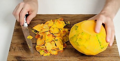 Cut away strips of skin by pushing the knife along the side of the pumpkin. You should be able to see where the inner flesh of the pumpkin meets the outer skin. Push the blade of your knife down the pumpkin from the end closest to you towards the other end. As you finish sections, rotate the pumpkin until it is completely peeled. Make sure to push the knife slowly and deliberately to protect your fingers from getting cut. Doing so also reduces the risk of cutting out the flesh.