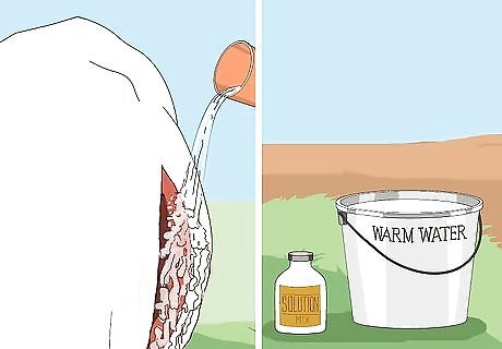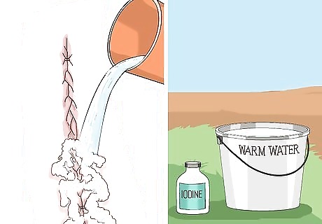 Clean the cow's abdominal cavity. With a bucket of warm water with about 10 ml of Solution mixed in, wash out the abdominal cavity and the skin to clean it of amniotic fluid and blood from the incisions and pulling out the calf. Repeat until area is clean.