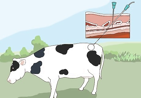 Local anaesthetic. Administer local anaesthetic to spinal area (which involves a long needle inserted into a specific area of the spinal cord) that incision will be done on. Anaesthetic should kick in a few seconds after being administered, "deadening" or numbing the area so that the cow will feel no pain when she is cut open.