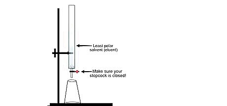 Fill the column approximately half-full with your least polar solvent, or eluent. It is important to begin with your least polar solvent because this will separate the least polar component of your mixture first. If necessary, when you have successfully eluted the first component you can switch to a second, more polar solvent to elute another component. Several eluents may be used to elute all components of your impure mixture.Step5_Fill_Column_Solvent2.jpeg