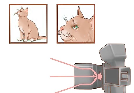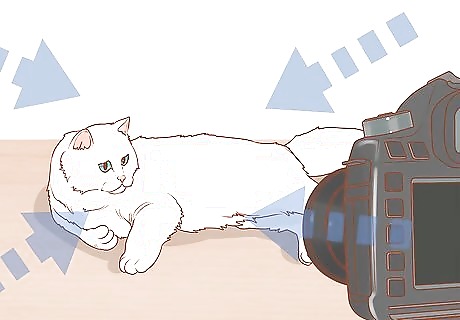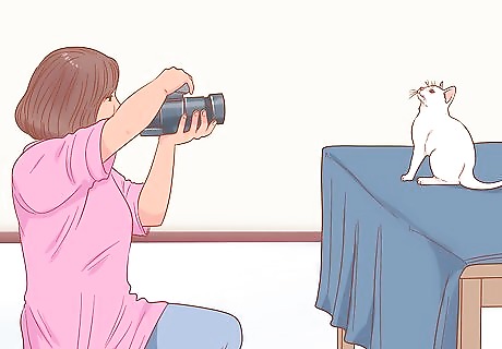 Shoot from several angles. Try shooting from a variety of places. You might start by photographing down at your cat while your cat looks up at you. Remember to shoot at your cat's level. But, you can also try raising your cat up while you get below her. This way, you can shoot up, with your cat looking down. There's not one perfect angle for photographing cats, so try several. You won't know what angles work best until you try photographing from them.