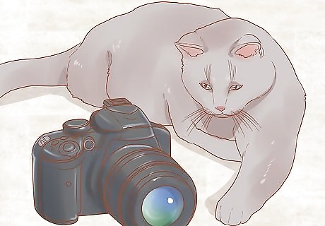 Let your cat check out the camera. Give your cat several minutes to sniff, look at, and check out your camera before you begin photographing. This will make her more comfortable with the equipment, so she'll be less likely to run off or be frightened by it. Give your cat a chance to warm up to being photographed. Don't expect to immediately take amazing photographs. Your cat will probably be curious for a few minutes.