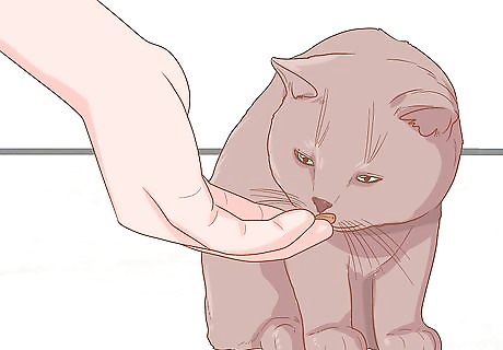 Give your cat treats. Treats like cat food treats or catnip can be great photography aids. Give your cat treats to reward good behavior, like sitting still for a minute. You can also give treats as a way to direct your cat's attention. For example, hold a treat near your head so your cat looks at you. This way, you can get a photo of your cat looking directly at the camera. You may want to ration out how many treats you want to give your cat before you begin taking pictures. This way, you don't accidentally give your cat too many treats throughout the session.