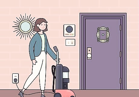 Vacuum the floors to remove any dust. Turn on your vacuum and make an effort to sweep over any major carpets and floor spaces in your home. Do your best to suck up any visible dust bunnies or specks of dirt before turning the vacuum off. Some vacuums have different settings for hardwood floors and carpets. As you clean, make sure you’re using the right setting.