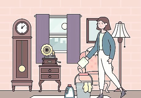 Clean off any surfaces that will be photographed. Spray or wipe down all countertops and tables that will be in your pictures. Focus especially on getting rid of any stains or smudges. Ideally, aim for each surface to be as polished and glistening as possible. Make sure that all vanity and hall mirrors are polished and shiny as well.