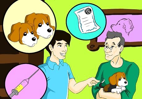 Ask questions. Whether you are working with a breeder or visiting animal shelters, do not be afraid to ask plenty of questions about the puppy and the business. Ask questions about how the puppies are raised and socialized, how the breeder handles the whelping (birthing) process, and if the puppy's parents have been tested for breed-specific diseases. Regarding the individual puppy, ask questions about his medical care—vaccination history, deworming history, presence of a microchip. For a purebred puppy, asking the breeder for the dog's registration papers is a good idea. Asking plenty of questions will help you be confident that you are picking a puppy from a reputable and respected business.