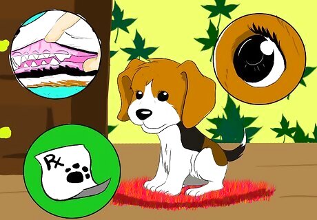 Examine the puppy's physical health. Good physical health is an important factor to consider when selecting the perfect puppy. Make sure to look the puppy over from head to toe, taking time to examine each body part and identify any abnormalities that could cause medical problems (and expensive veterinary bills) later in the puppy's life. Look at the puppy's eyes—they should be bright and clear without any crusts or discharge. Look at the entirety of the puppy's face, including the ears, nose, and mouth. His ears and nose should be clean and free of discharge, and his gums should be pink. Watch and listen to the puppy's breathing. The puppy's breathing should be quiet and easy. You can watch his chest as he breathes. Look at and examine the puppy's bone structure. Bone abnormalities could indicate nutritional deficiencies or genetic musculoskeletal abnormalities that would require veterinary care. Check the puppy's overall body condition. The puppy should look well fed, with some fat over his rib cage. If he is well fed, his coat will look shiny or glossy. Have the puppy examined by a veterinarian if you are unsure that you can perform a thorough physical examination on your own.
