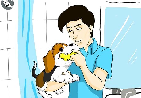 Look at how the puppy reacts to people and noises. The perfect puppy will know how to act properly around people. You can test your puppy's temperament around people in many ways. For example, you can call the puppy to you and see how he responds. A friendly puppy will eagerly walk towards you and enjoy the attention. A fearful puppy may run away from you or display behavior such as tucking his tail or staying in a cowered position. An independent puppy would like ignore your calls. You can also cradle the puppy in your arms to see how he reacts to being held. He may enjoy it (e.g., relaxed and calm body language), or he may do everything he can (e.g., squirm, snarl, bite, defecate) to try to get out of your arms as quickly as possible. Clap your hands or make another loud noise—just once—to test how the puppy responds to sudden loud noises. A puppy who is overly sensitive to loud noises may be a challenge, since he would likely not be able to enjoy different activities with you. You can also observe if the puppy has a tendency to guard things. A negative response to you approaching him when he is eating (e.g., snarling, biting), could signal a serious behavioral problem that could get worse as he grows older. Testing the puppy's jaw control is also important. It is a good sign if he loosens his jaws when you let him know ('ouch!') that he's bitten too hard. A puppy who ignores your reaction could develop a biting problem that worsens over time unless resolved promptly.
