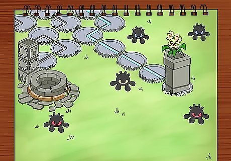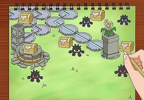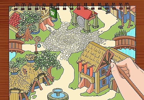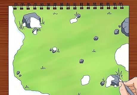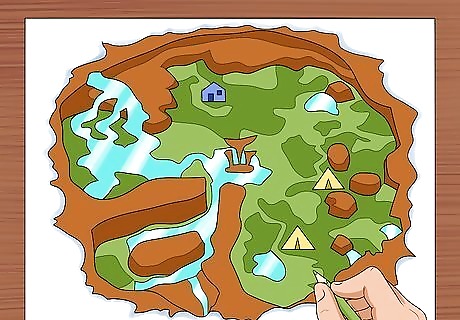 Draw your map. Draw the adventure map on a large piece of paper or several pieces of paper taped together. Make sure the tape is all on one side of the map though, as having tape on the drawing side makes it very difficult to get the pencil lines to show up. Don't forget to color your map!