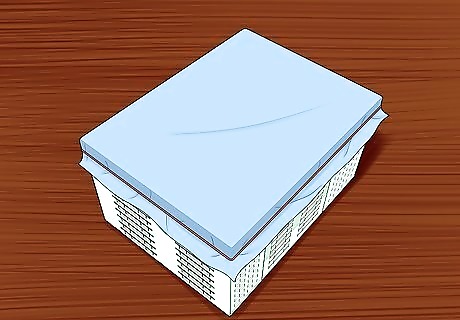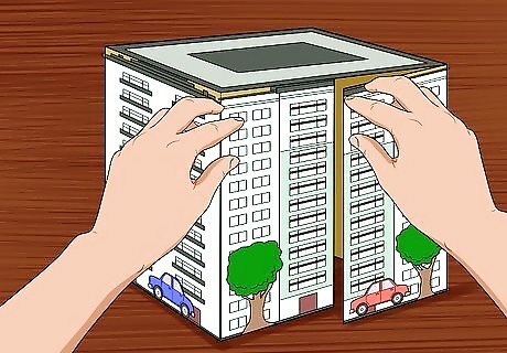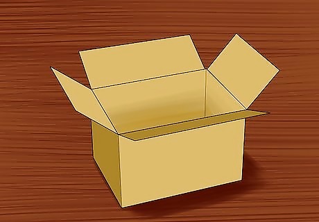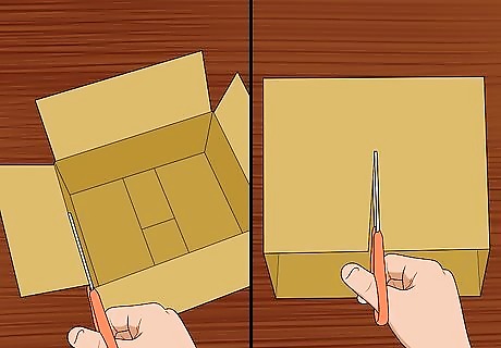 Cut open the front of the cardboard box directly in the middle vertically. You can also cut the entire box except the back in half horizontally.