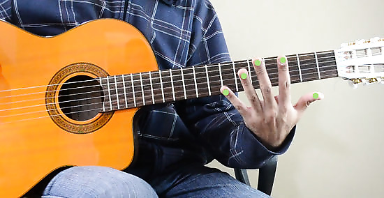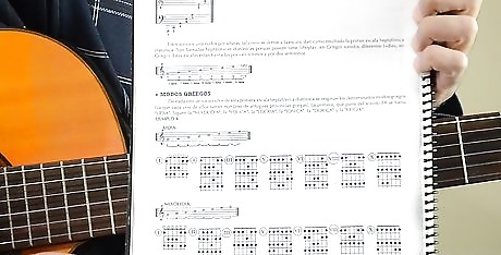 Study pattern diagrams. You can find pattern diagrams online or in books on how to play guitar. By memorizing these diagrams, or finger shapes, you can easily play a number of different scales and chords up and down the neck of your guitar. Pattern diagrams may be the easiest way for you to learn if you are a visual learner. Finding patterns also can be more fun than memorizing notes or following an interval formula. The pattern diagrams show you where to place your fingers when you're playing a chord. Typically the root note is a black dot and the other notes are blank dots. You also might see finger numbers or notes. Use the type that's easiest for you to understand.