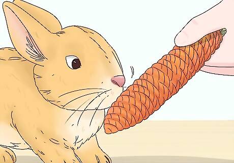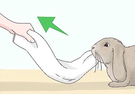 Let the rabbit grip the towel or toy. Approach the rabbit with a towel or toy. Let the rabbit smell the towel or toy and chew on it. Wait until the rabbit has the towel or toy in its mouth. You can encourage the rabbit to grip the towel or toy by putting it directly in front of the rabbit’s mouth. It may then sniff the towel and start to chew on it.