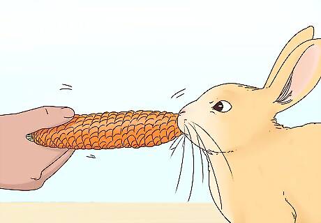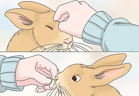 End playtime with petting and a treat. Wind down the rabbit at the end of the play session by petting its head and belly gently. Do this for one to two minutes so the rabbit can calm down. You can also offer the rabbit a treat as a reward for a good play session.