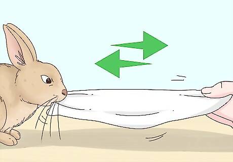 Pull gently on your end of the towel or toy. Once the rabbit has the towel in its mouth, gently tug on the other end. Do not yank or tug too hard on the towel, as this can damage your bunny’s teeth. Give the towel a light pull so the rabbit can pull it back. Never try to pull the rabbit along with the towel, as this can injure its teeth. Don't jerk it from side to side, either, as this can injure it's neck, jaw, and spine. Instead, only pull gently enough to give a little resistance to the bunny’s tugs.