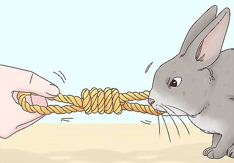 Use a toy rope. Rabbits can also play tug of war with a toy rope made out of woven cloth. You can buy toy ropes for bunnies at your local pet store or online. Look for a toy rope that is small enough for your rabbit to handle. You can use toy ropes made for very small dogs, or designed specifically for rabbits. Alternatively, you can make your own by tying knots along a thick strip of felt or terry cloth. Avoid rope toys made of plastic or nylon, as they can be hard on your rabbit’s teeth. Hemp or felt are good options.