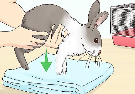 Take the rabbit out of its cage in a contained area. Start off playtime by lifting the rabbit out of its cage and placing it on a soft surface like a carpet or towel. Make sure you close all doors and windows so the rabbit cannot escape. Make sure you have a non-slip surface for your rabbit. This helps protect its legs and back during play time. You can also take out the towel or toy so it's nearby.