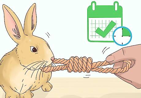 Schedule regular play time with the rabbit. Make an effort to play with the rabbit at least once a day for ten to fifteen minutes. Schedule in playtime with the rabbit at the same time every day. For example, you may designate ten to fifteen minutes in the morning before school for playtime. Or you may make play time with the rabbit at night before bed.