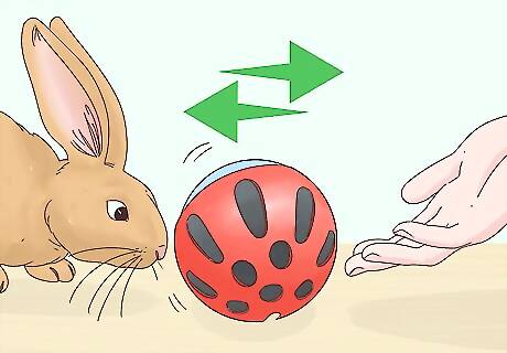 Switch to other games after a few rounds. Tug of war is a fun game for your bunny, but it can be hard on its teeth and mouth. Have a few rounds of tug of war with the rabbit, then switch to other games. Allow the bunny to play with other toys or on its own. This way, the rabbit’s teeth and mouth are not at risk of injury. Rabbits like to climb and hop around, especially on ramps and soft surfaces like carpet. You can play a game where you encourage the rabbit to climb or hop to a certain spot by tapping on the spot. You can also use a treat to encourage it to climb or hop. You can also use a rubber ball to play with the rabbit. Try rolling the ball to the rabbit. Encourage it to roll the ball back to you by making a rolling motion at the rabbit.