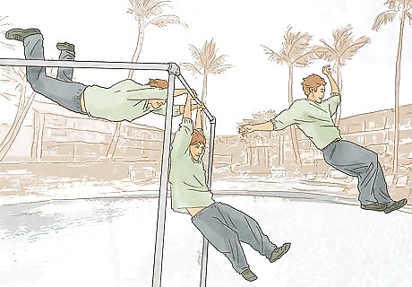 Swing through the air. Find a horizontal bar you'd like to swing from and jump towards it. Before catching the bar with your hands, curl your body and bring your legs up and forward. Once your hands make contact with the bar, add to the momentum and direct your body forward. When you are doing parkour, be careful that any bars you grab onto are sturdy enough to hold your weight.