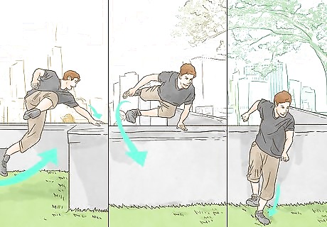 Vault at full speed. While doing parkour, you will often need to bypass medium-sized obstacles without slowing your run. To do this, you will likely perform a speed vault: As you approach the obstacle, kick off from the ground using your left leg while raising your right. Simultaneously reach your left arm forward and place one hand flat on the object. Avoid contacting the obstacle before your body is airborne. As your hand catches the obstacle, use the momentum from your kickoff to bring both legs together up towards your right side. Use your left arm as a pivot to direct your body's momentum over the obstacle. Once you're over the object, land on your left foot to regain vertical posture. Return to your run.