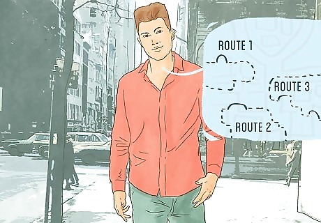 Plan parkour routes when you aren't running. You can do this when you're walking around your city or taking the bus to work. Look around you. Take note of nearby structures and think about how you would interact with them to get from an imaginary point A to point B. If there is a large horizontal bar in your path, does it make more sense to vault over it or slide under? Which would be faster for you? Where do you see potential footholds on the sides of buildings? If there is a gap between ledges, could you make the jump, or should you climb down one and climb up the other?